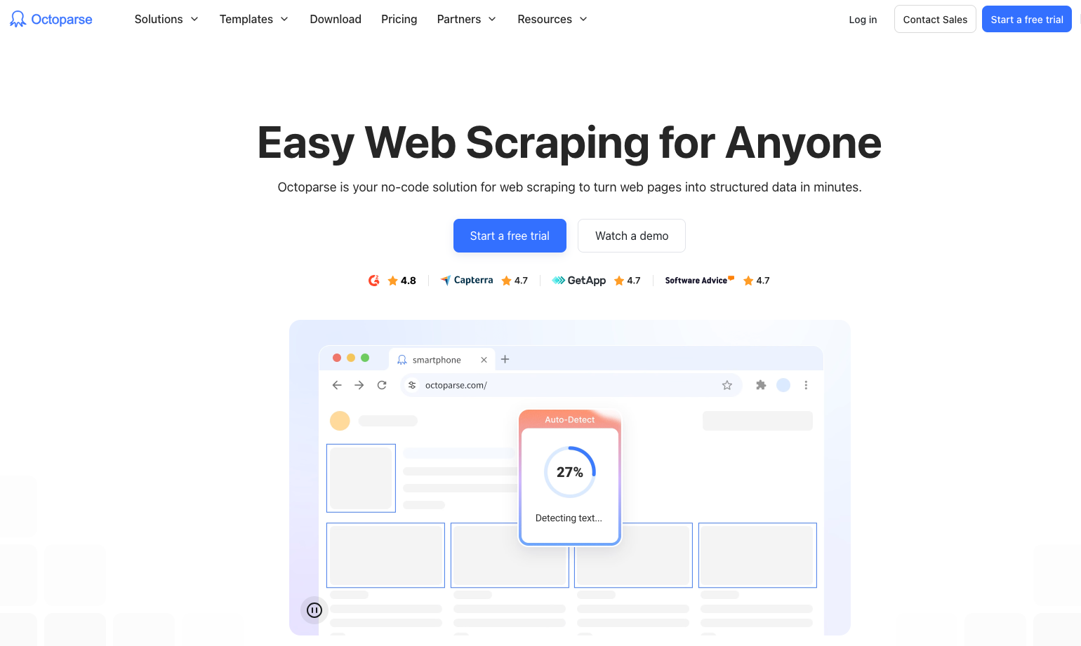 | Octoparse | Templates + beginners | No | Yes | 10,000 records/mo | Paid only |